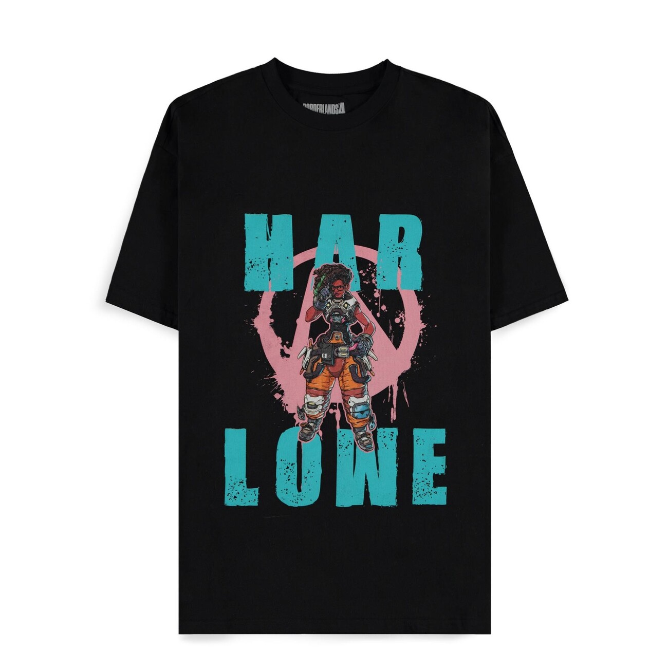 Harlowe на преден план: голям, контрастен мотив на гърдите привлича вниманието от раз и води директно към вселената Borderlands. Отпечатъкът е мек и удобен, а 100% памукът с класическа кройка дава лекота през целия ден. Ясна връзка с Borderlands — суров, но стилен.