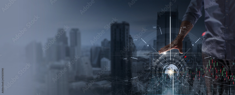 Картината върху платно Businessman with compass navigator and market research, Business growth, purpose and direction for business development