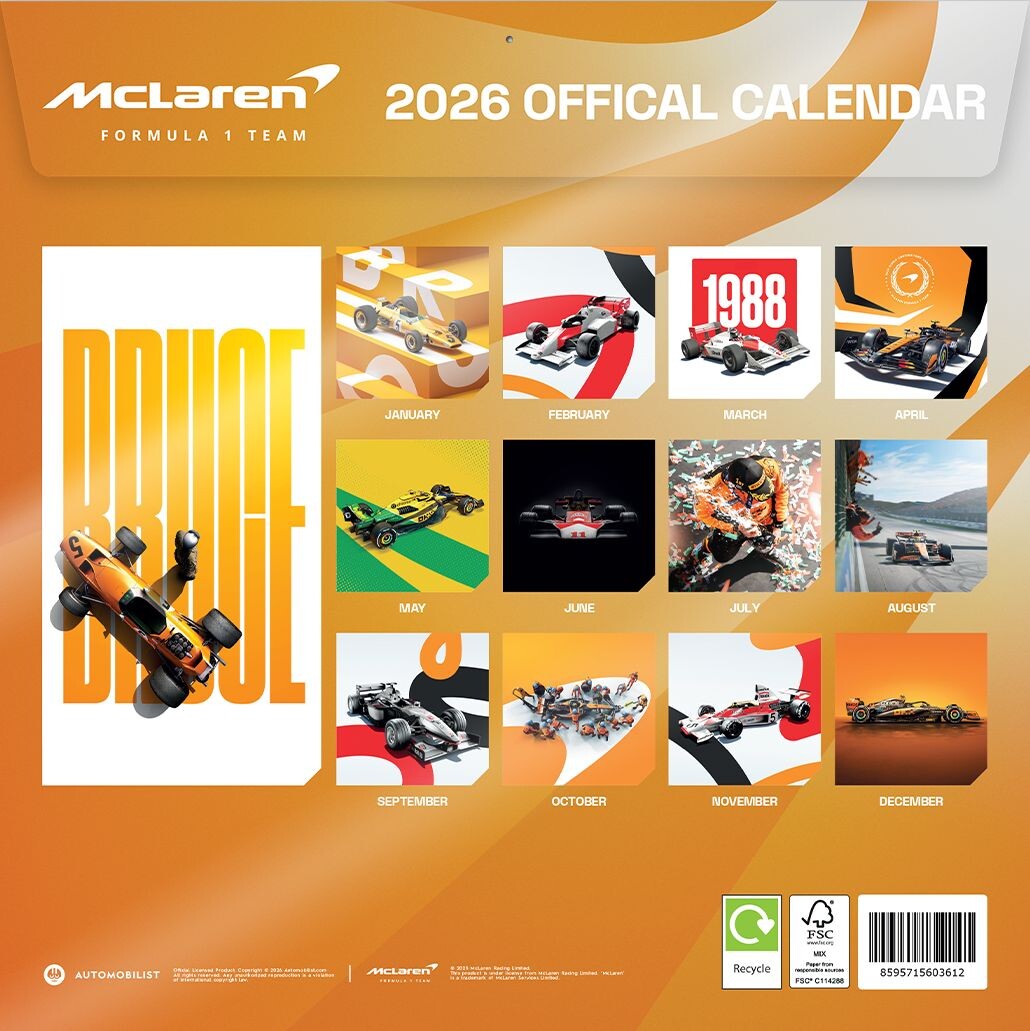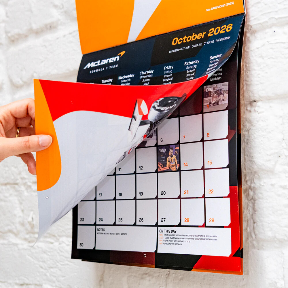 Отпразнувайте легендарния път на McLaren с Официалния календар McLaren 2026, който предлага 12 ексклузивни визуа̀ли, проследяващи историческото минало на отбора и настоящите му успехи.