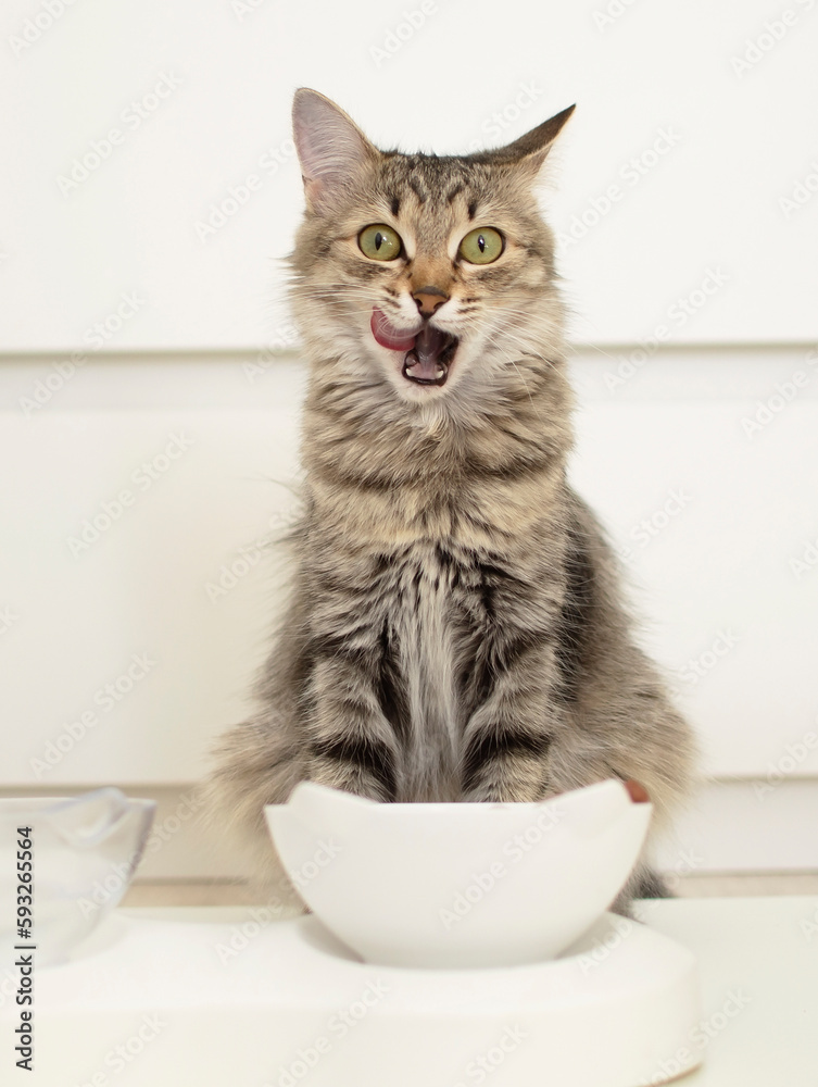 Фотография Funny gray cat sits near white cups, licks her lips after eating on white background