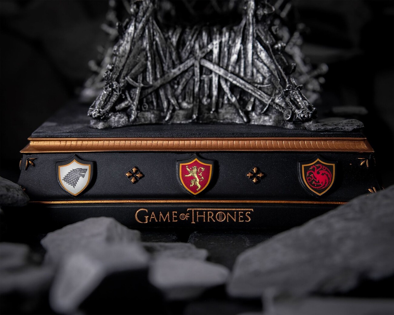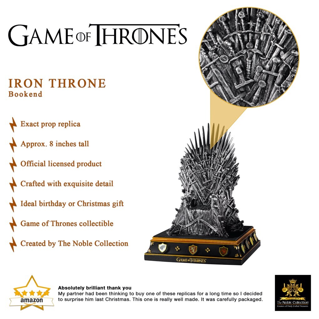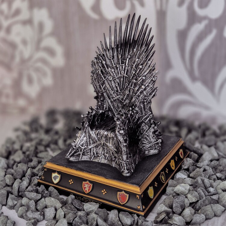Прецизен детайл на легендарен тронЖелезният трон е върховният символ на сила и власт - и сега той може да стои на стража над любимите ви истории. Изработен от здрава смола и ръчно рисуван с прецизност, този поставка за книги пресъздава всеки детайл от екранния си аналог. Величественият дизайн е украсен с емблемите на основните домове на Вестерос - от Старките до Ланистърите.