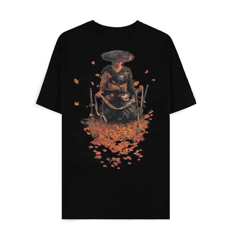 Официална черна тениска Ghost of Yōtei с дискретно лого отпред и голям, драматичен принт по целия гръб. Изработена от 100% памук за приятен допир, с класическа кройка за целодневен комфорт. Вечна основа с ясен намек към любимия ви свят.