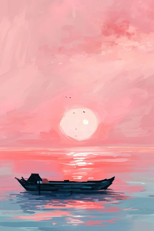 Плакат Boat in the middle of the sea at sunset