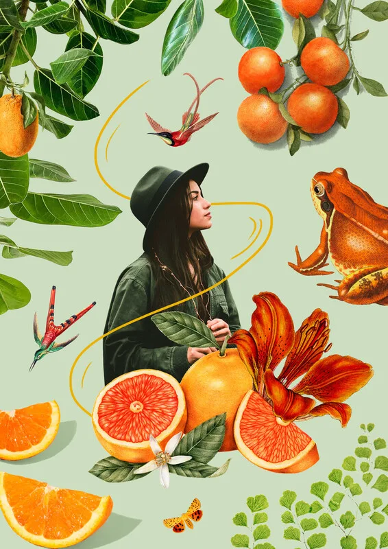 Collage of the jungle explorator. The woman looks at the surrounding nature. Main colors: green and orange