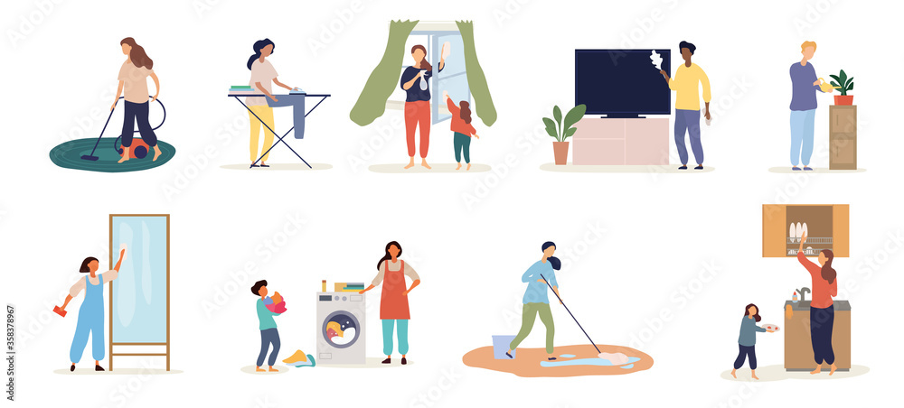 Фотография Set of 9 scenarios of people doing housework cleaning the house, washing, garden