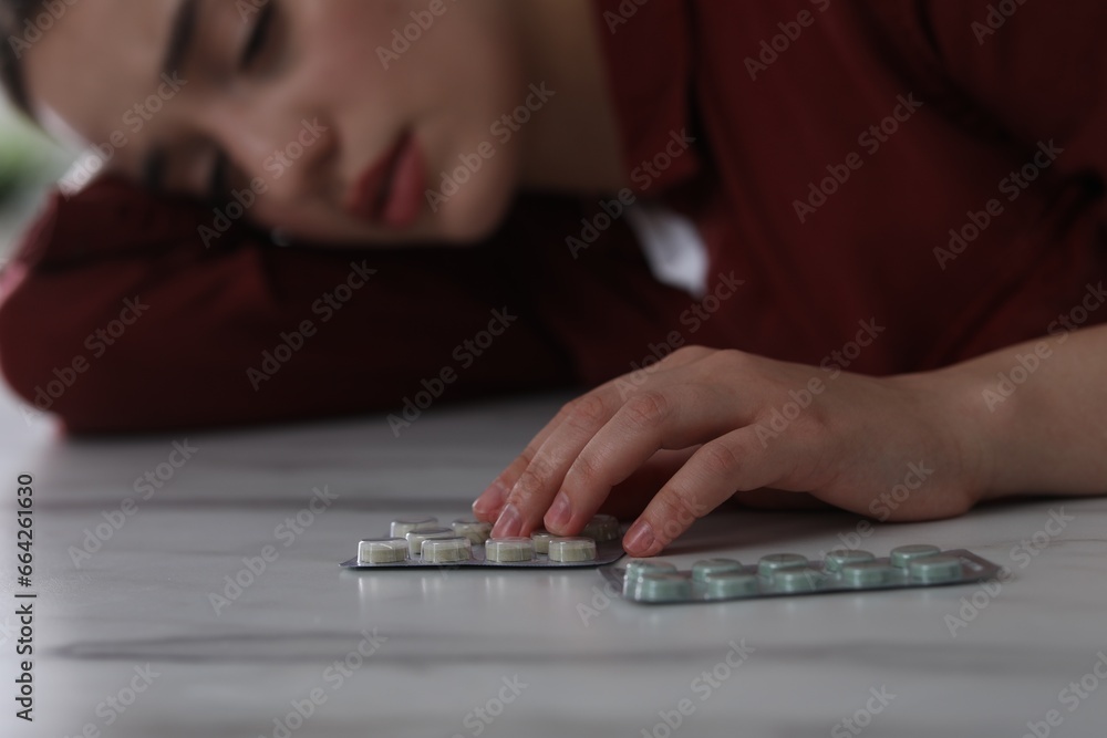 Картината върху платно Woman with antidepressant pills sleeping at white marble table, selective focus